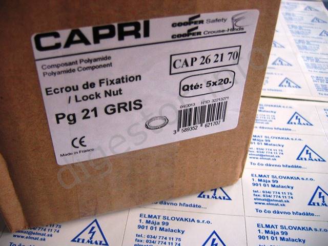 Karta prerobená z BK (Bulk) na kusovky - DOPREDAJ Od 1.1. 2020 cenníková cena Cooper Capri France: 36 € bez DPH/100ks CAP262170 ECROU PG21 PA GR- price list € 17.23 / 100 PC BK=bulk=MJ Merná jednotka je 100ks balenie. Polyamide locknut Svetlosivá farba RAL 7035.