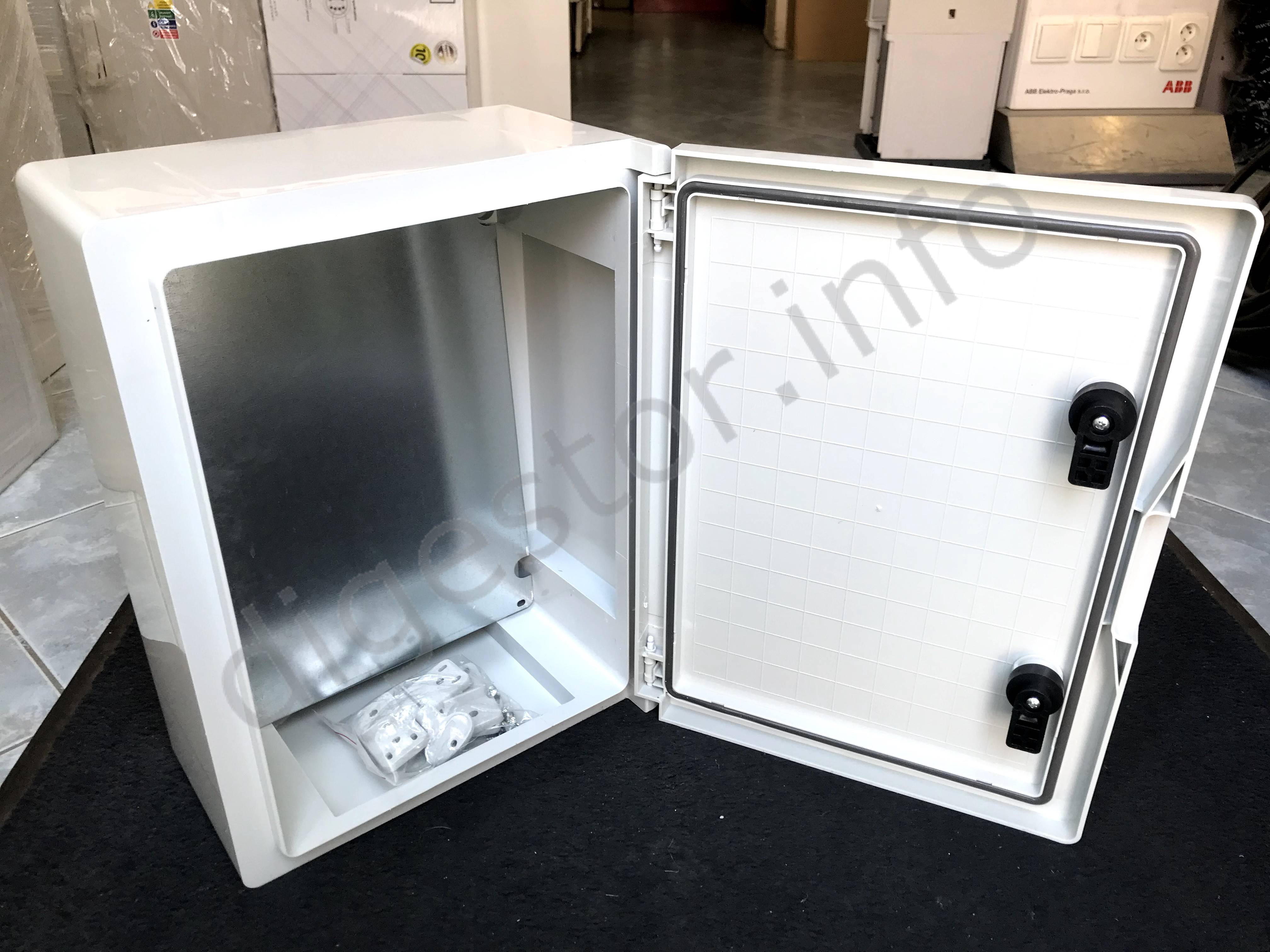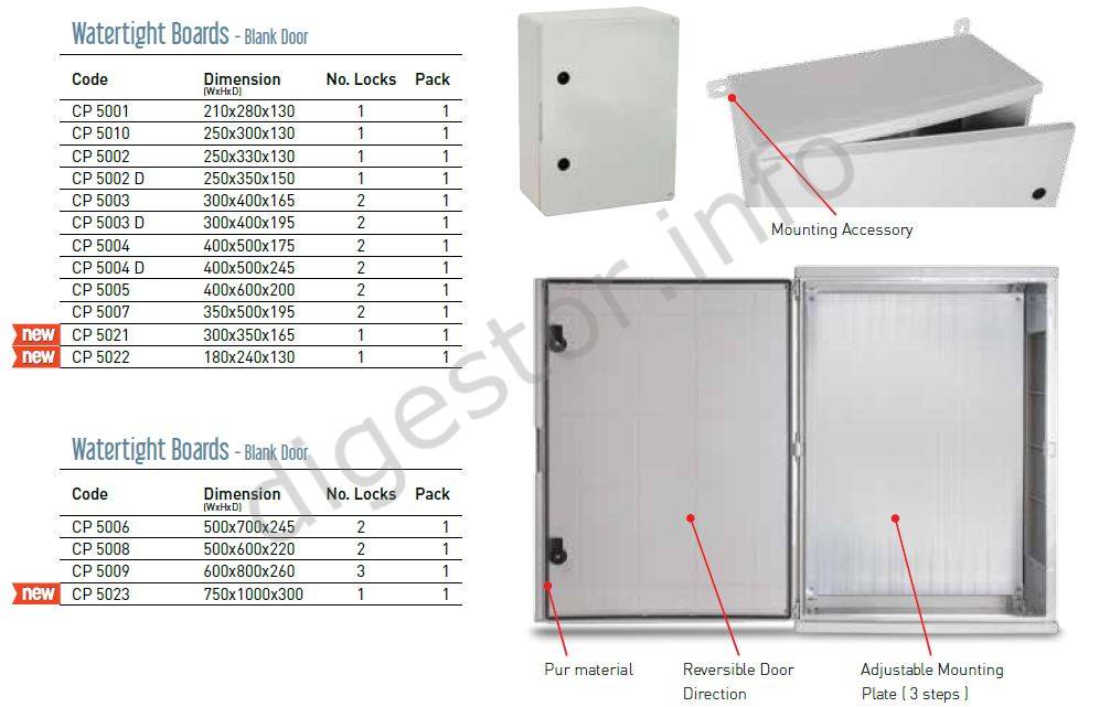 Prázdna Skrinka CP 5004, 40x50x17,5cm + Montážny plech +Nástenné úchyty, ABS sivá IP65 Prázdne Plastové vodotesné skrinky CP s plnými dvierkami PUR tesnenie Reverzibilné dvierka Montážne úchytky na stenu v balení Nastaviteľný 1mm Montážny galvanizovaný plech (3 stupne) Počet zámkov 1 alebo 2 - podľa rozmerov skrinky Skrinky s priehľadnými dvierkami na dopyt Ďalšie príslušenstvo na dopyt: Zámok s 2 kľúčmi, montážne príslušenstvo na stožiar (len pre väčšie investičné projekty). Ceny pre investičné projekty sa stanovujú na základe množstva a môžu byť výrazne odlišné. Prices for the investment projects are determined on the base of the business case volume and might be significantly different. ***Ste Firma, Inštitúcia, alebo Obchodník? Dajte si nastaviť Vaše ceny!*** Tel.: +421-903/430803, elmat@elmat.sk ***Are you a Company, Institution or Trader? Let us to set up Your prices!*** Tel.: +421-903/430803, elmat@elmat.sk WATERTIGHT BOARDS blank door Technical Characteristic Watertight Boards in Thermoplastic Material for Protection Devices for Residential, Commercial and Industrial Areas. • Ral 7035 Grey • ABS Material • Halogen Free • IK 10 - GWT 650°C • Triangle Lock-Key • PUR Material for High Quality Sealing • Included 1mm. Galvanized Mounting Plate • Included Wall Fixing Bracket • Operating Temperature , -25 to +60C