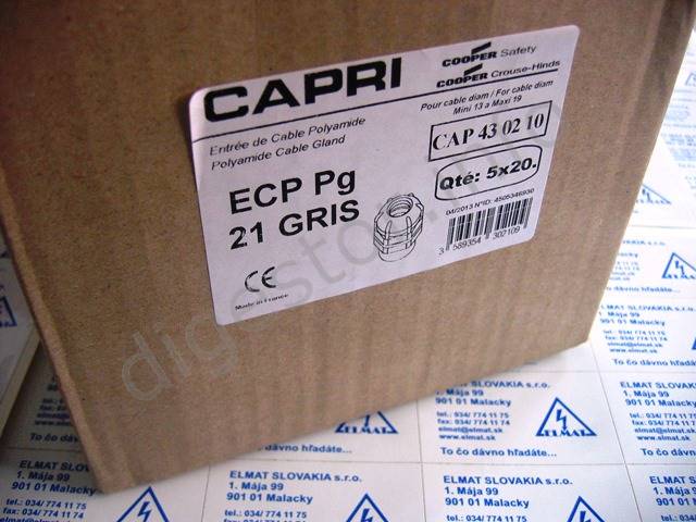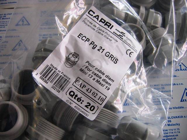 Karta prerobená z BK (Bulk) na kusovky - DOPREDAJ Od 1.1. 2020 cenníková cena Cooper Capri France: 73 € bez DPH/100ks Káblová vývodka Cooper Capri. CAP430210 (replaces old version) ECP PG21 N°09 PA GR. BK=bulk=MJ Merná jednotka je 100ks balenie. Polyamide cable glands IP68 poskytuje aj bez plochej tesniacej podložky. Svetlosivá farba RAL 7035. Voliteľné príslušenstvo: Matice: LOCKNUT CAP262170 a ďalšie matice, adaptéry a redukcie. Podložky: NEOPRENE SEALING WASHER CAP242149 FIBER SEALING WASHER CAP242150 PREBUNAN O-RING CAP242146 PVC REDUCE RING CAP241635