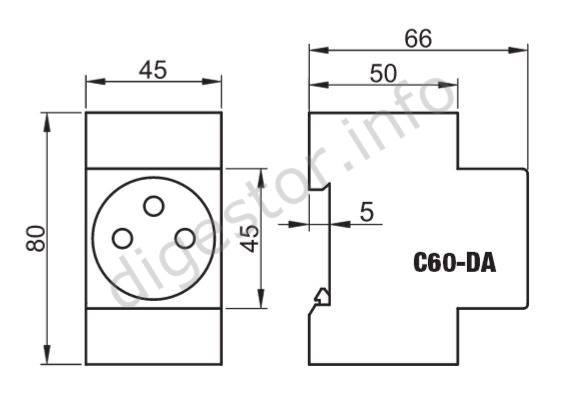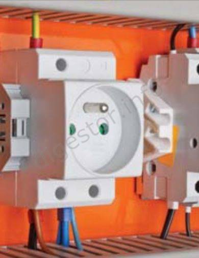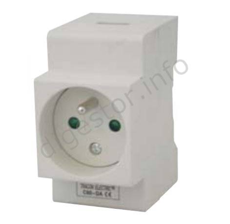 Zásuvka modulárna sieťová, s ochranným kolíkom 230V, 16A, 2P+E, na DIN lištu, C60-DA Niekedy nazývaná aj tzv. soklová zásuvka, alebo zásuvka na DIN lištu. Používa sa k napájaniu spotrebičov a zariadení sieťovým napätím priamo v hlavných, podružných, elektromerových rozvádzačoch. Je upevniteľná na montážnu lištu s rozmermi 35×7,5 mm podľa STN EN 50022 alebo do rozvodných skríň typu EDS resp. EDFK, samozrejme aj do iných typov (KLV...). Spomenuté 2 typy majú DIN lištu vylisovanú z plastu priamo ako súčasť tela skrinky. Technické parametre Zaťažiteľnosť: 250 V/16 A Prierez prívodných vodičov: max. 2×2.5 mm2 Ochrana krytím: IP 20 Prevádzková teplota: -25 °C ... +55 °C