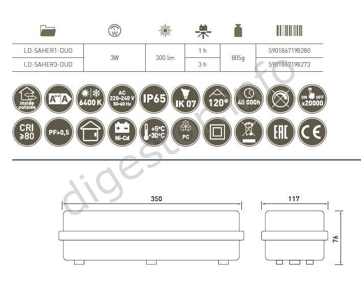 Núdzové LED svietidlo LD-SAHER1-DUO, 1h 3W 300lm 6400K IP65 NM piktogramy,