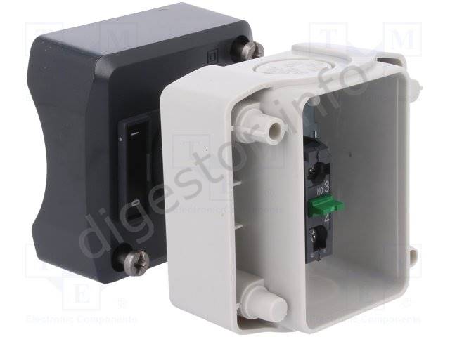 Skrinka XALD102, 1 otvor - Jednotlačítko KOMPLET, I/x Zelená/x plastová, 1NO, Harmony XALD, Style 5, IP65 Použiteľné aj ako "zvonkové tlačítko" s vysokým krytím IP (napr. v prípade 230V domáceho zvončekového systému - kvôli bezpečnosti). 1 otvor pre XB5 fi 22mm ovládacie a signalizačné jednotky (hlavice osadené - 1 impulzné tlačidlo = 1x Zelená). Spínacie jednotky osadené: 1x Zapínacia. Materiál: Polykarbonát Farba základne: svetlo - sivá RAL 7035 Farba krytu: tmavo - sivá RAL 7016 1 vytláčacie otvory pre káblové vývodky Pg13 a ISO M20 zhora a zdola 1 vytláčacie otvory pre káblové vstupy max. 14mm zo zadnej strany 3 A at 240 V AC-15, A600 conforming to EN/IEC 60947-5-1 3A x 230V = 690W max zaťaženie ***Are you a Company, Institution or Trader? Request us for setting of your prices!*** Tel.: +421-903/430803, elmat@elmat.sk ***Ste Firma, Inštitúcia, alebo Obchodník? Dajte si nastaviť Vaše ceny!*** Tel.: +421-903/430803, elmat@elmat.sk