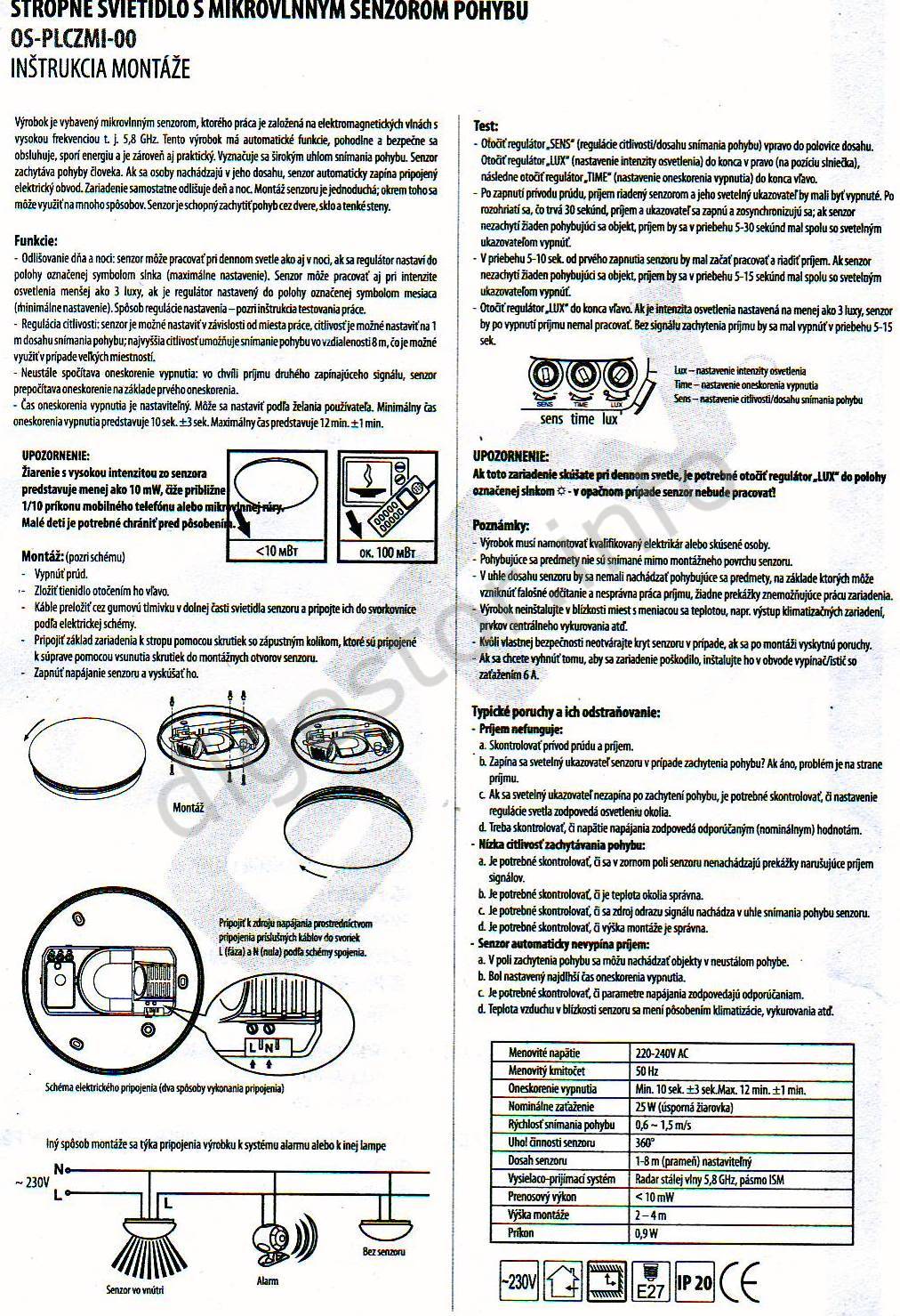 Napájacie napätie: 230Vac.